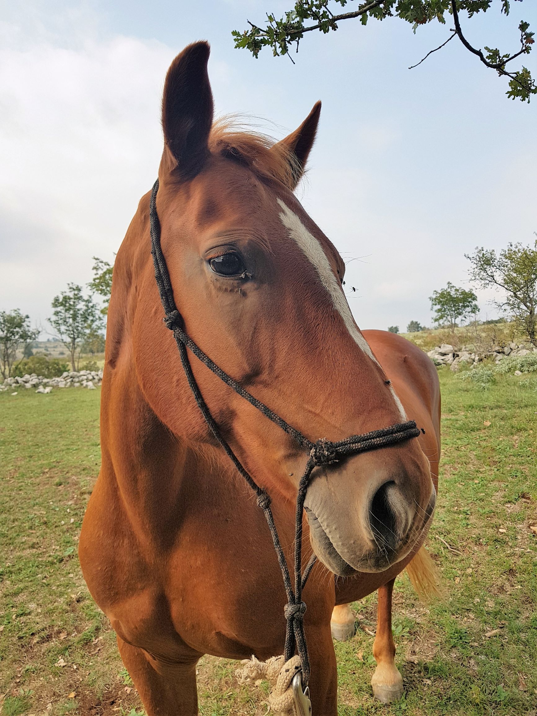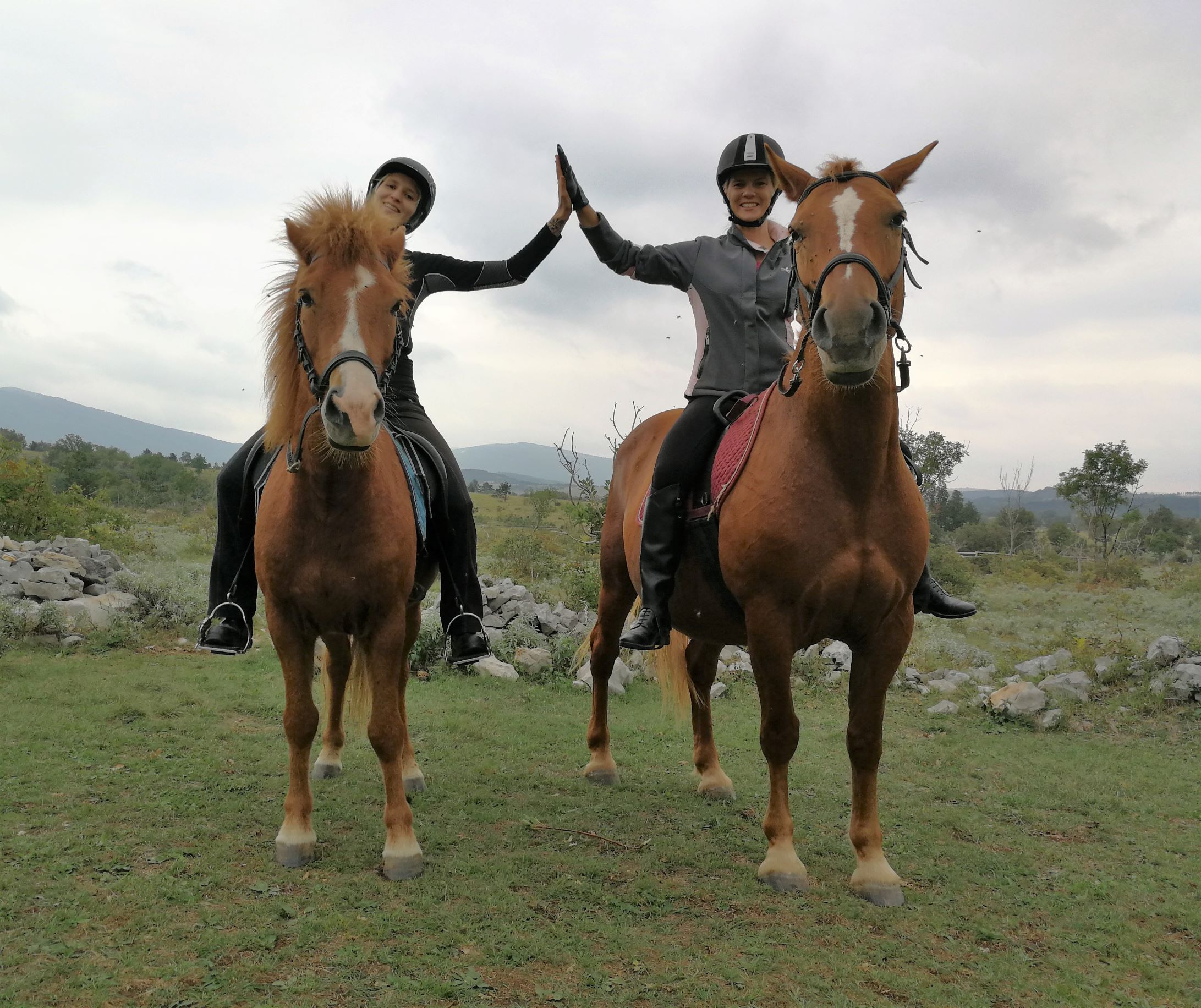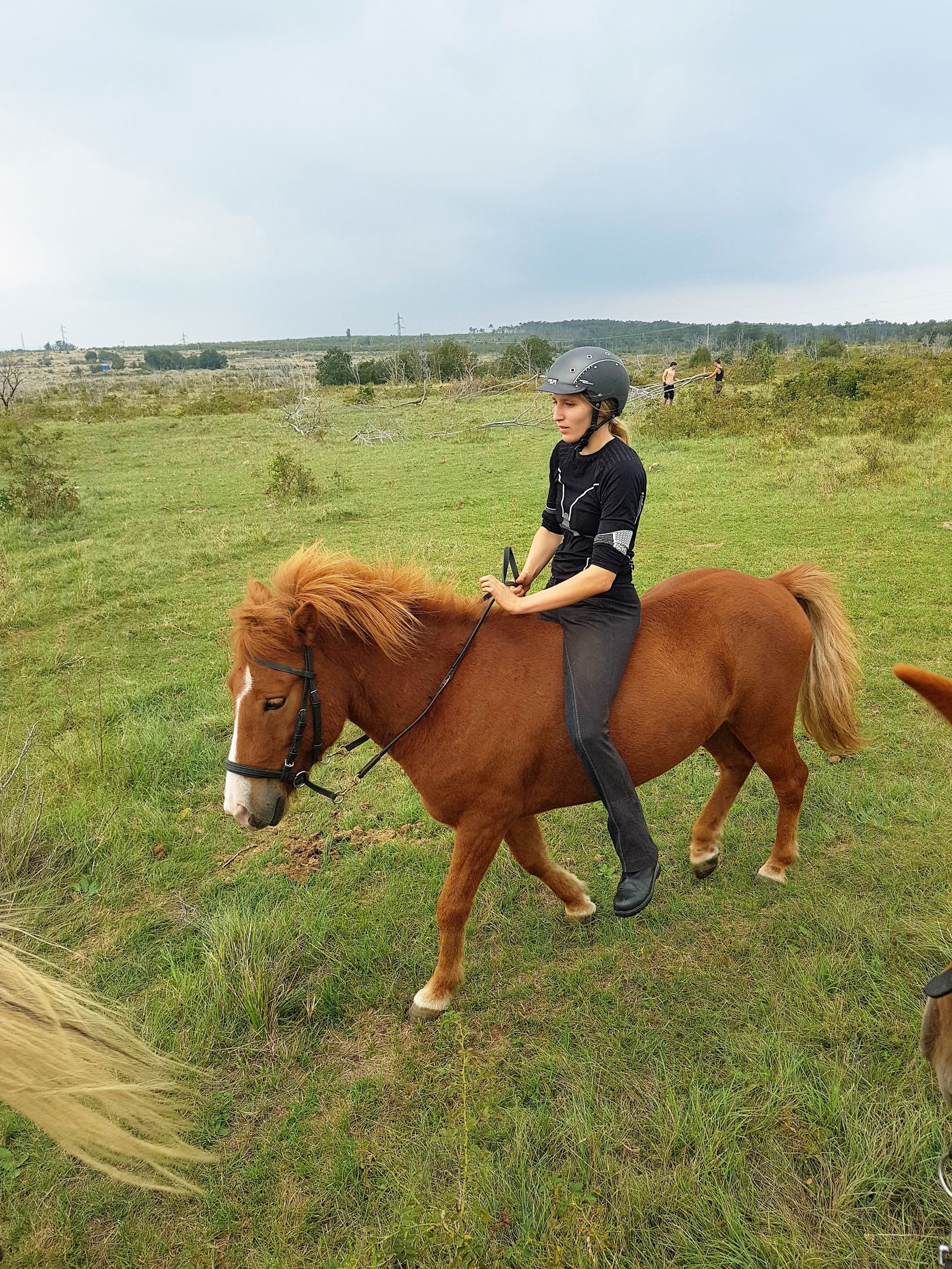 Put terena nas je vodio blizu granice Slovenije i Hrvatske. Vidik s pružao skroz do Ćićarije. Oko mene su se prostirali krajolik i vegetacija kakvu još nisam imala prilike vidjeti. Onako, baca na Istru no ipak sa više zelenila, sa gušćom vegetacijom i bez one karakteristične crvene istarske zemlje. Svega je poneki odlomak vapnenačkog kamena provirivao i odzvanjao pod topotom kopita. Zaista nešto posebno za doživjeti. Čak je i Tonga koja se u početku nešto bunila, vrlo brzo pokazala znakove opuštenosti te je veselo kasala noseći me na leđima uz zadovoljno frktanje nozdrvama. Putem smo susreli krdo divljih konja. Konji koji službeno imaju svoga vlasnika, no nikad nisu bili dirnuti od ljudske ruke te neometano galopiraju prostranstvom i vladaju tim prekrasnim krajolikom. Dobro su nas promotrili iz daljine te, uvjerivši se kako ne predstavljamo nikakvu opasnost, mirno nastavili dalje svojim putem.