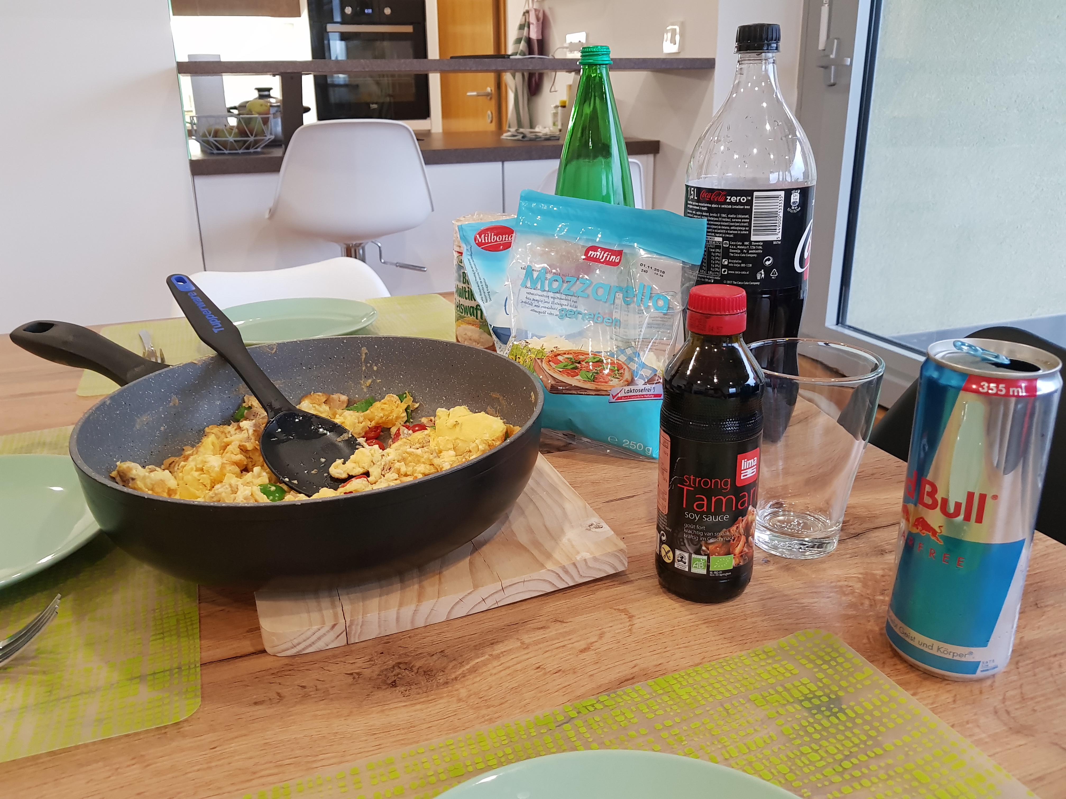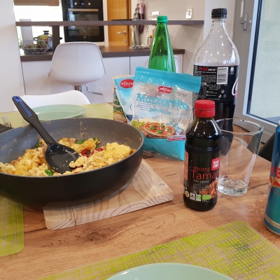 Nakon treninga uslijedila je klopa, a Kaja je pripremila sve šta treba. Moram priznati da je dobar osjećaj kada ti netko pripremu klopu i to točno po tvom ukusu i tvojim makronutrijetivnim potrebama. Obzirom da Kaja naginje prehrani sa što manje mesa, a ni ja ne bježim od toga, za ručak je složila predobaru kajganu sa mozzarellom i salatom, za večeru je pripremila saft od slanutka i tofua, te kao prilog rižu. Još kad se to sve začini sa soja sosom i na to posipa naribana mozzarella, okus je nevjerojatan!